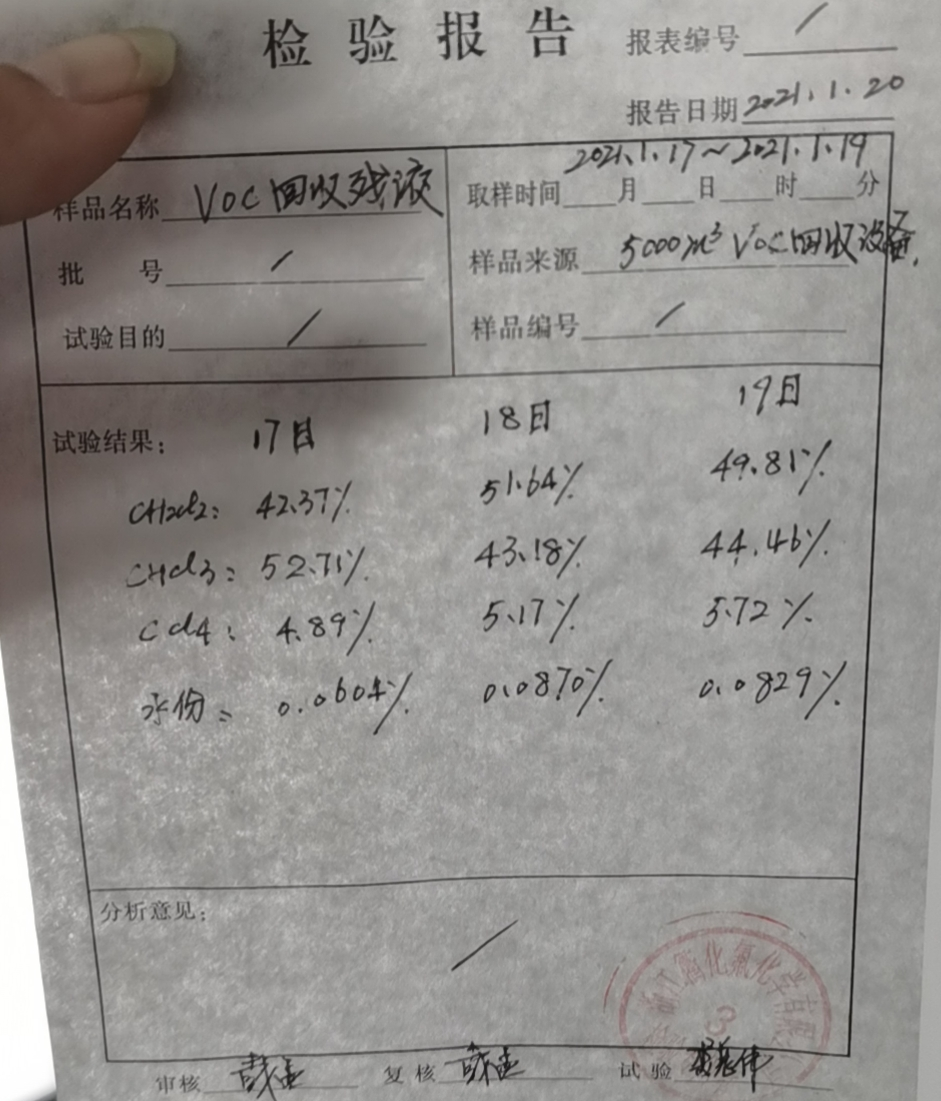 回收溶剂和废水经过氯离子定性分析,确认含氯废气在吸附解吸回收过程中无分解变质。